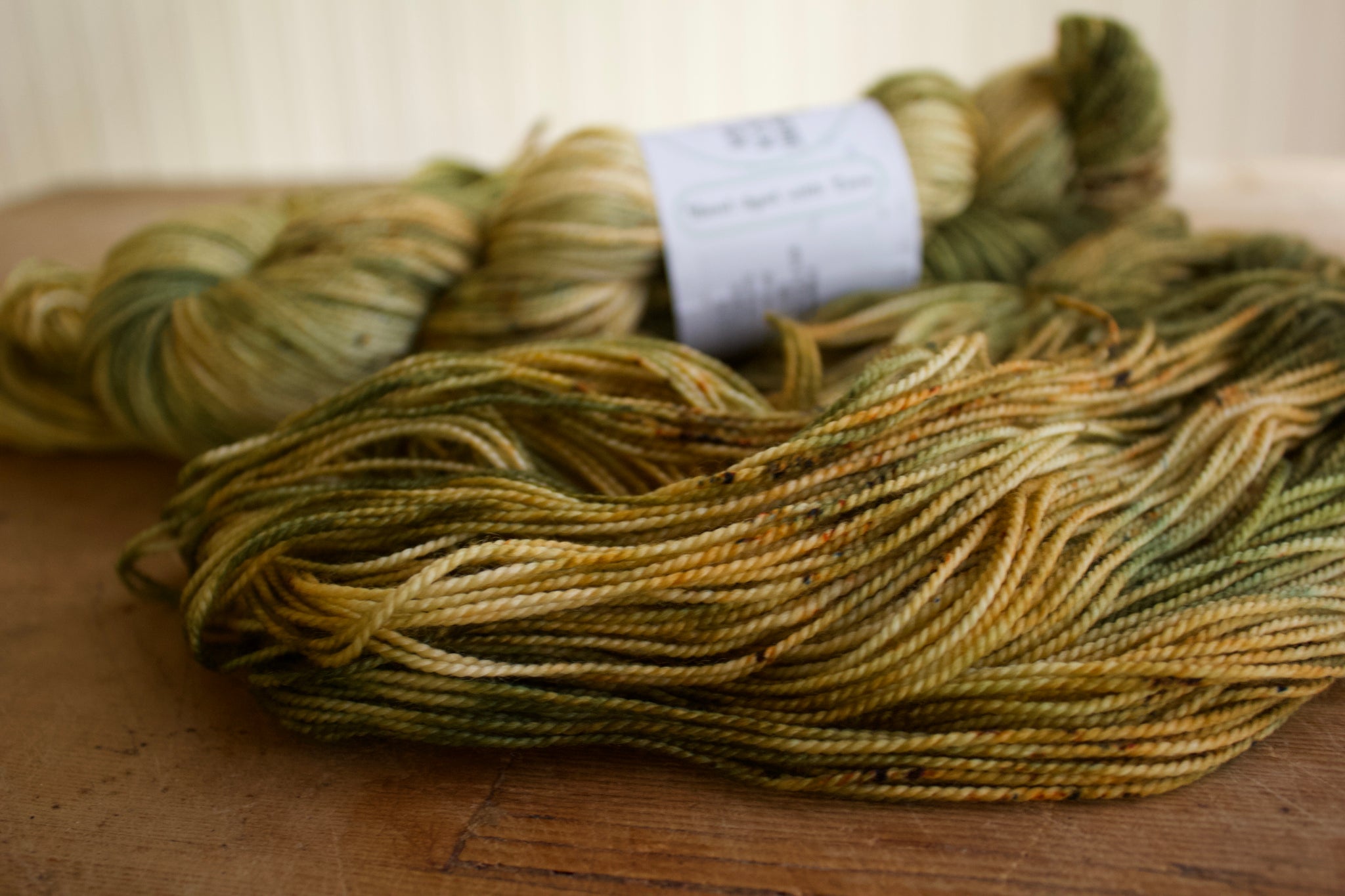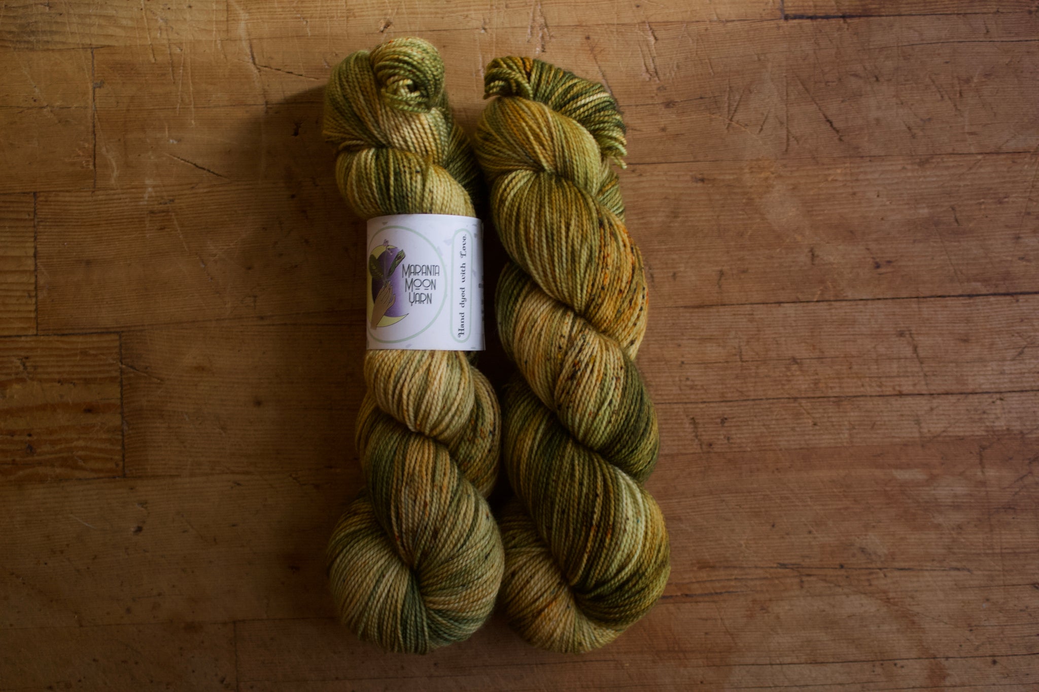 This colorway is inspired by an illustration I love of a Luna Moth. This yarn is slightly variegated with creams, golds, olive green, and pale teal. It has olive, gold, and brown speckles.